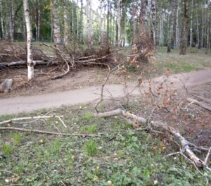 По словам жителей, вместо того, чтобы вывезти из рощи поваленные год назад деревья, чиновники начали строительство внутри рощи автомобильной дороги.