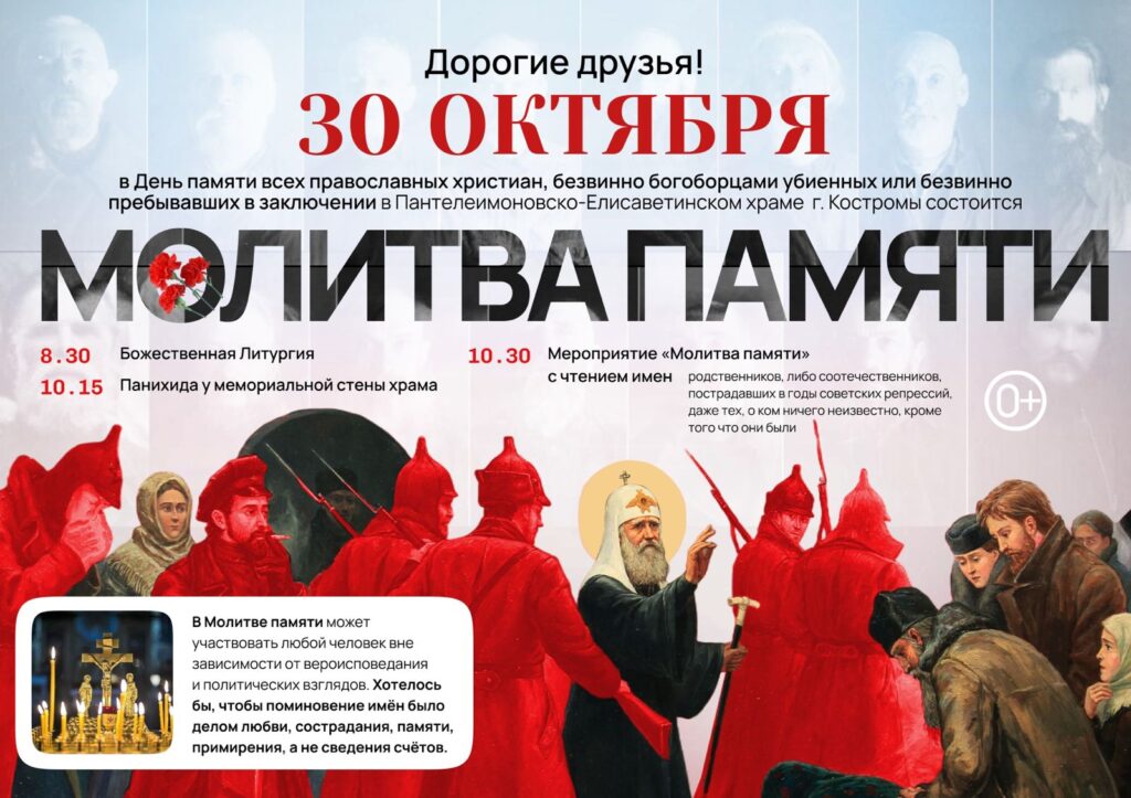 В 10:30 у мемориальной стены Пантелеимоновско-Елисаветинского храма костромичи прочитают имена земляков, безвинно пострадавших от репрессий. Каждый пришедший сможет подойти к микрофону и вслух произнести имена из Книги памяти, получив листочек с краткой историей: имя, возраст, род занятий и приговор. Можно будет назвать и имена своих репрессированных родственников.