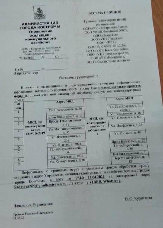 Мэрия Костромы разослала по управляющим компаниям города документ, предписывающий провести обязательную дезинфекцию в тех домах, где выявлены случаи заболевания новой коронавирусной инфекцией, а также контактировавшие с заболевшими.