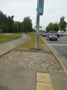 По нормативу кнопки ставят на высоте не выше 90-120 см, в Костроме же кнопка у остановки близ почты на улице Костромской поставлена на уровне 125 см. Инвалиду на коляске дотянуться до нее невозможно, да и доехать тоже: участок, ведущий к кнопке, просто «забыли» заасфальтировать.