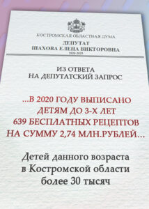 «В соответствии с постановлением Правительства Российской Федерации от 30.07.1994г. №890 в течение 2020 года по программе региональной льготы детьми в возрасте до трех лет получено лечения медикаментами в сумме 2,74 млн. рублей по 639 льготным рецептам. Выписка льготных рецептов для детей до трех лет осуществляется в поликлиниках по месту жительства в рамках утвержденных перечней», – говорится в ответе департамента здравоохранения Костромской области на депутатский запрос Елены Шаховой.