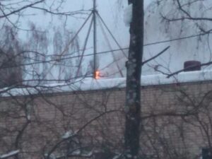 Пламя виднеется в районе антенны, расположенной на крыше здания.