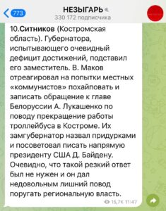 В канале, который активно читают в Администрации президента РФ, политологи указали, что заместитель Маков “подставил” Ситникова, посоветовав жителям-“придуркам” жаловаться не Лукашенко, а “напрямую Байдену”.
