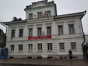 Особенно сильно изменилась улица Симановского. На ней фасад приемной «Единой России» завесили искусственным плющом, а на соседний исторический особняк, расположенный напротив здания ФСБ, водрузили вывеску из красного кумача «МИРУ-МИР!».